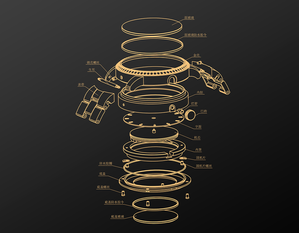 It pioneered the inlaid structure of the inner liner of gold watches. Through a unique inner liner structure design, a 316l steel liner is inlaid inside the gold case,Standing out among traditional high-end case and barrel structure watches, it redefines a special structure of gold watches. This structure has been granted a national utility model patent,Enhance the water resistance and functional stability of gold watches,Patent Number: CN201420830432.0.